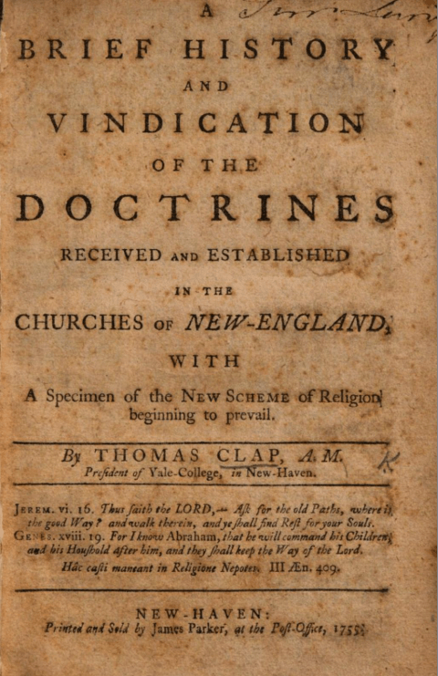 In 1755, he authored A Brief History and Vindication of the Doctrines Received and Established in the Churches of New England. Therein, Thomas Clap vindicates the common faith of the New England churches as confessed in her Confession–the Savoy as amended at Boston in 1680–and Catechism; the Westminster Shorter Catechism.